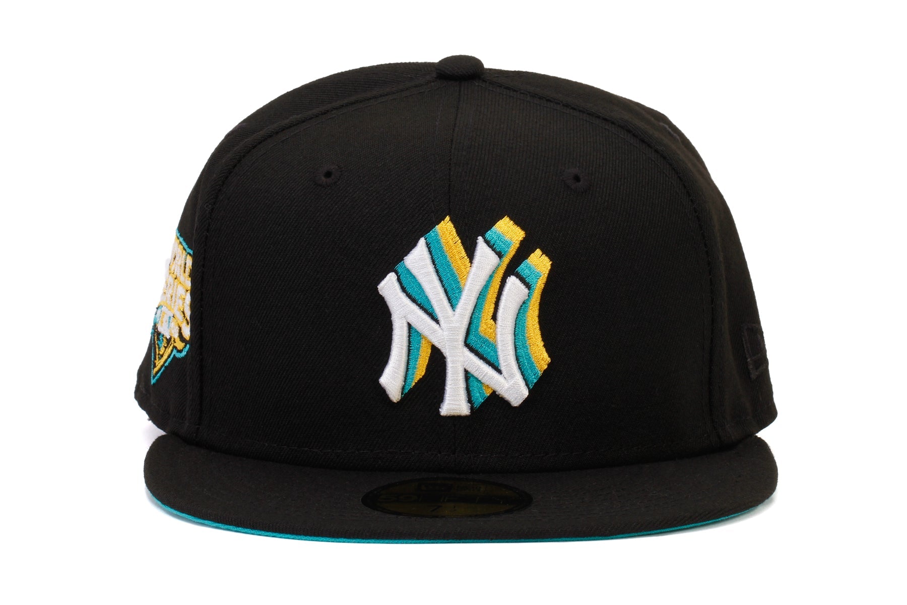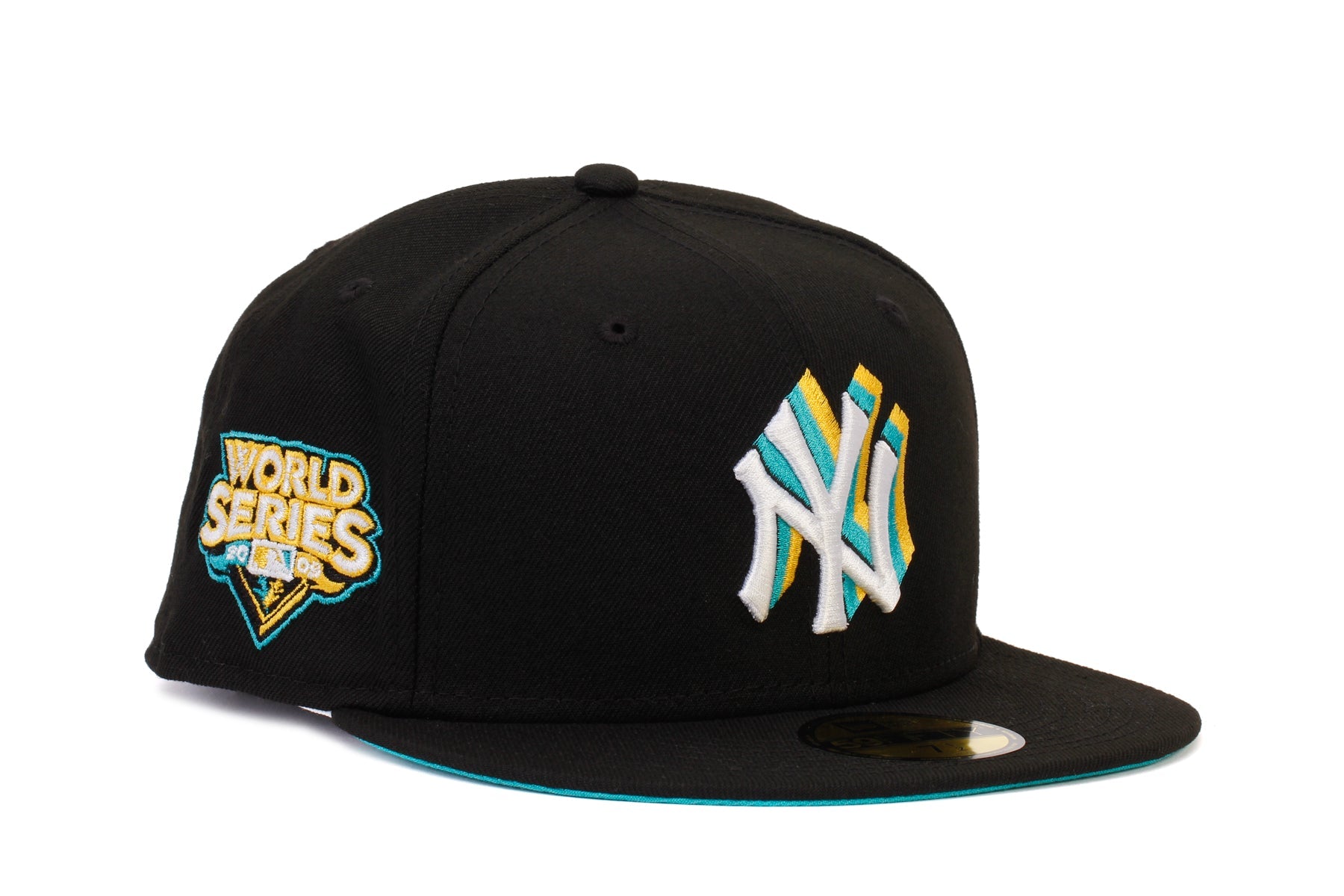 This exclusive New Era 59FIFTY fitted New York Yankees cap displays a multi-colored embroidered NY logo on the front panel. It includes a 2009 World Series Champion side patch on the right side and an MLB Batterman logo at the back, complemented by a teal undervisor for a distinctive finish.